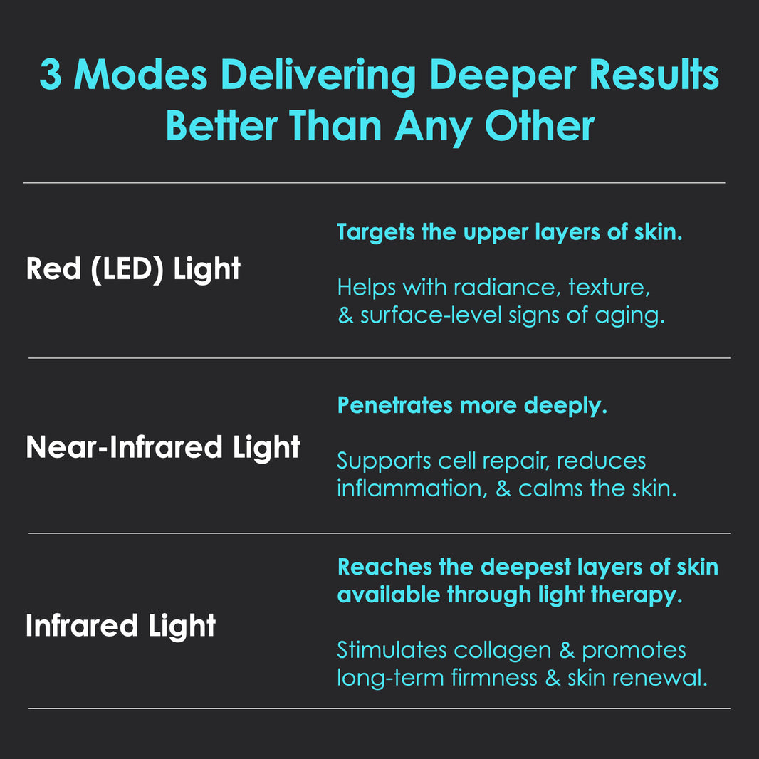 - Near-infrared + infrared modes — many masks skip these deeper-acting settings