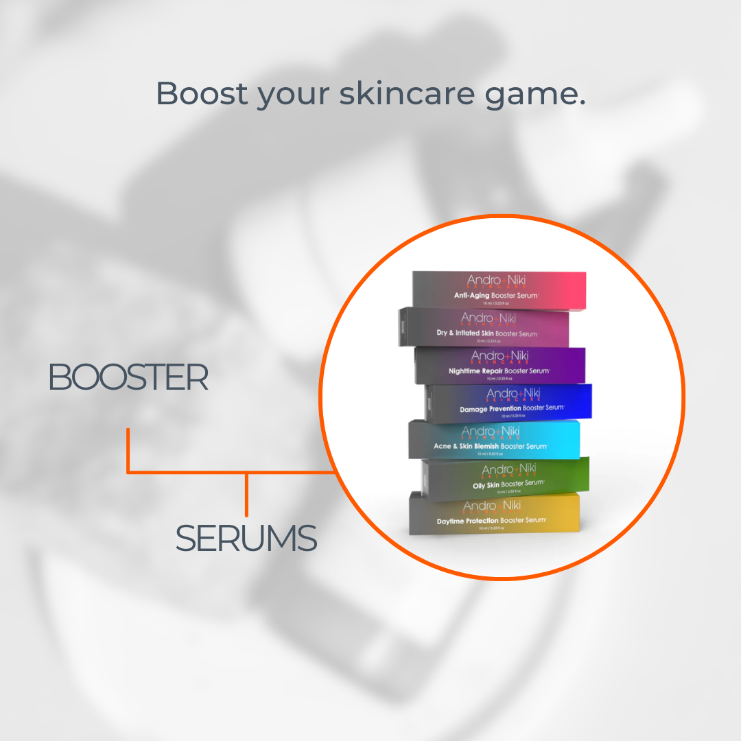 Formulated to slow down visible signs of aging, Andro+Niki Anti-Aging Booster Serum combines the antioxidant power of vitamins A, B, C, and E to nourish and rejuvenate your skin.